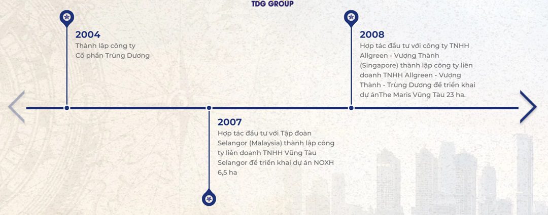 - 2008: Thực hiện hợp tác đầu tư với công ty TNHH Allgreen – Vượng Thành (Singapore) để thành lập công ty liên doanh TNHH Allgreen – Vượng Thành – Trùng Dương nhằm thực hiện dự án The Maris Vũng Tàu với diện tích 23 ha.