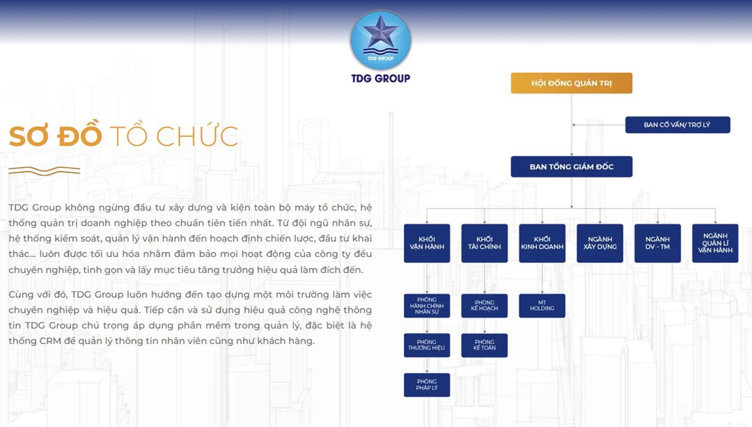 TDG Group không ngừng đầu tư vào việc phát triển và kiện toàn bộ máy tổ chức, hệ thống quản trị doanh nghiệp hiện đại nhất. Đội ngũ nhân sự, quản lý vận hành, hệ thống kiểm soát, đầu tư khai thác và hoạch định chiến lược đều được tối ưu hóa liên tục để đảm bảo rằng mọi hoạt động của công ty đều chuyên nghiệp, tinh gọn và hướng tới mục tiêu tăng trưởng hiệu quả.